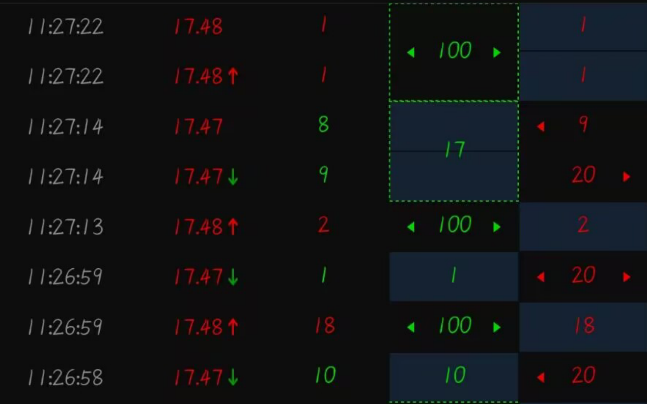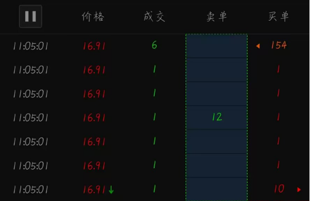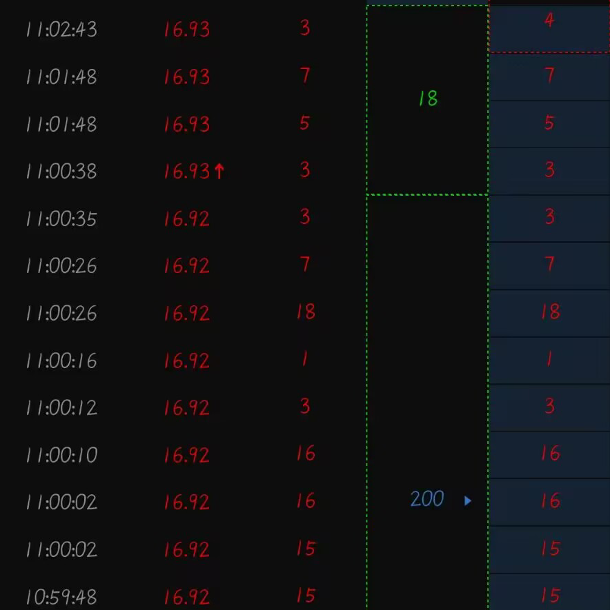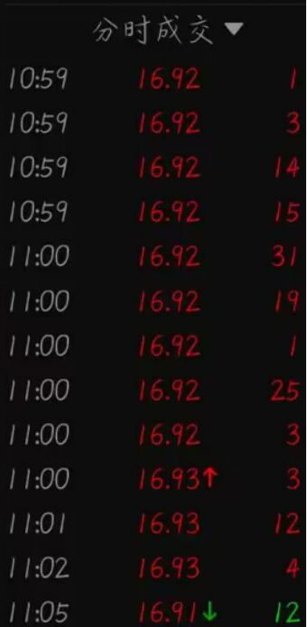 11:05 分为主动卖出交易, 从逐笔还原来看, 交易委卖价格 16.91 是 盘口的买一价, 为主卖立即成交. 而从逐笔还原的买单列并结合超级复盘的盘口看, 这 12 手卖单是由 10手中剩余的 1 手, 5 个 1 手和 154 手中的 6 手组成. 其中逐笔还原图中 154 手处向左的箭头表示之后还有撮合. 这个 154 手是合计了之后的撮合成交的手数之和, 最后一笔撮合的 154 手会显示向右的箭头, 中间的撮合部分左右箭头都显示, 在这笔成交中只有 6 手, 154 手的委托买一手数可能更大, 只是撮合成交了 154 手而已. 对于主动买入的逐笔交易还原也是类似的.