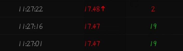 关于东方财富的逐笔还原数据 东方财富手机 APP 端有一个逐笔还原功能, 一般在东方财富月均资产在 1w 以上可以免费领取 Level 2 分时成交明细和 十档盘口与千档盘口, 不同的交易标的对应不同的盘口数量. 同时除了逐笔还原数据外, 还有买一和卖一的 全息队列, 交易分布 和 逐笔委托 数据. 现在对逐笔还原数据和分时成交数据进行比较. 为了能看明白其中的原理, 这里选一个交易不那么活跃的来进行分析.