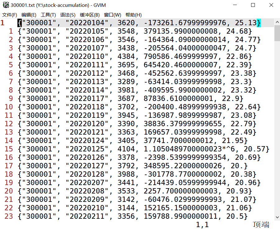 一些常量 1 2 3 4 5 6 STOCKDATAMAINDIR = "Y:\\stock-data\\" ; STOCKACCDATA = "Y:\\stock-accumulation\\" ; STOCKCODEDIRS = FileNames [ "*" , STOCKDATAMAINDIR ] ;