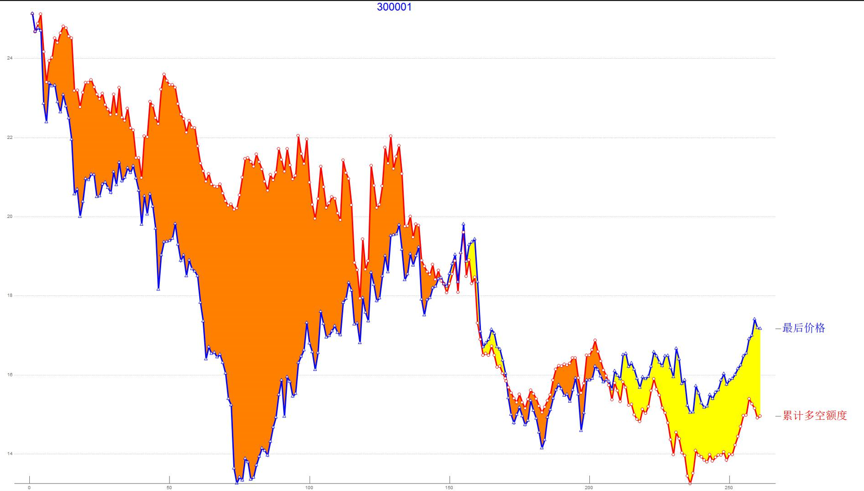 计算 累计多空额度, 也就是主动买入额减去主动卖出额的累计值. 然后将每日收盘价 (最后价格) 按照比例贴在图标中. 做这个统计的目的是作为一种参考, 多空额度的下跌表示几天的净交易中, 卖出情绪比较积极, 长期主卖可能预示着股票跌入低谷. 反之, 买入情绪比较多, 容易达到顶部区域.