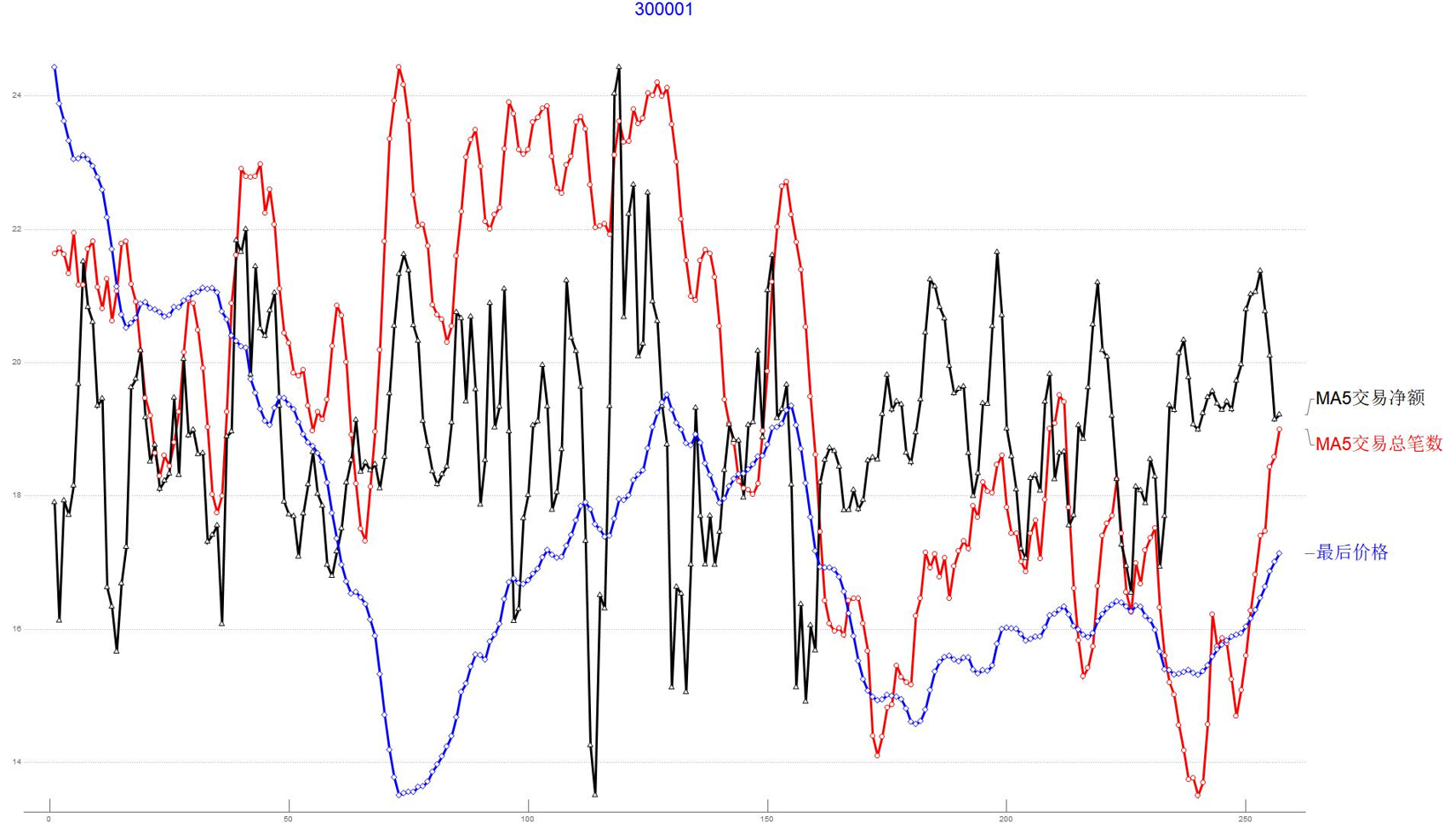 模型3 以下代码统计了5日内交易净额与交易笔数的走势. 需要注意收盘价达到谷底时的交易净额与交易笔数的增大时刻, 这有可能是大资金入场的隐秘操作.